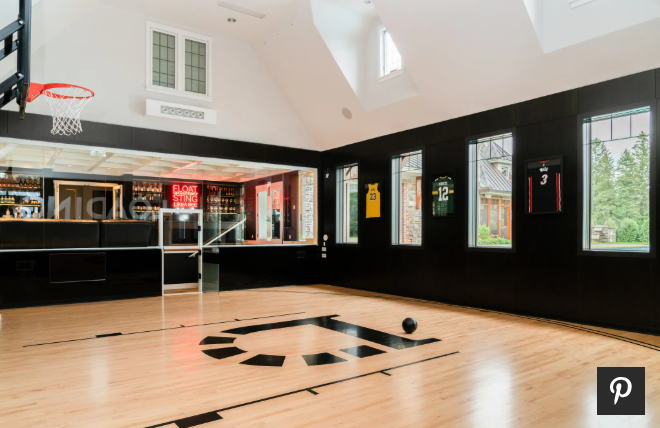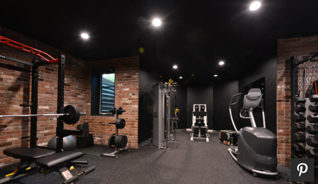 One of the simplest home gym ideas, if you have the space to create it, is the addition of a sports court. A half-court indoors is certainly a luxury, but one that can make exercise all the more alluring—just take a look at the Tiffany Thompson–designed half-court in D’Angelo Russell’s Minnesota home, which is accessorized with a neon sign and framed jerseys. Depending on where you live, exterior space is often easier to come by and could allow for the creation of a full court, or even a tennis or pickleball court.