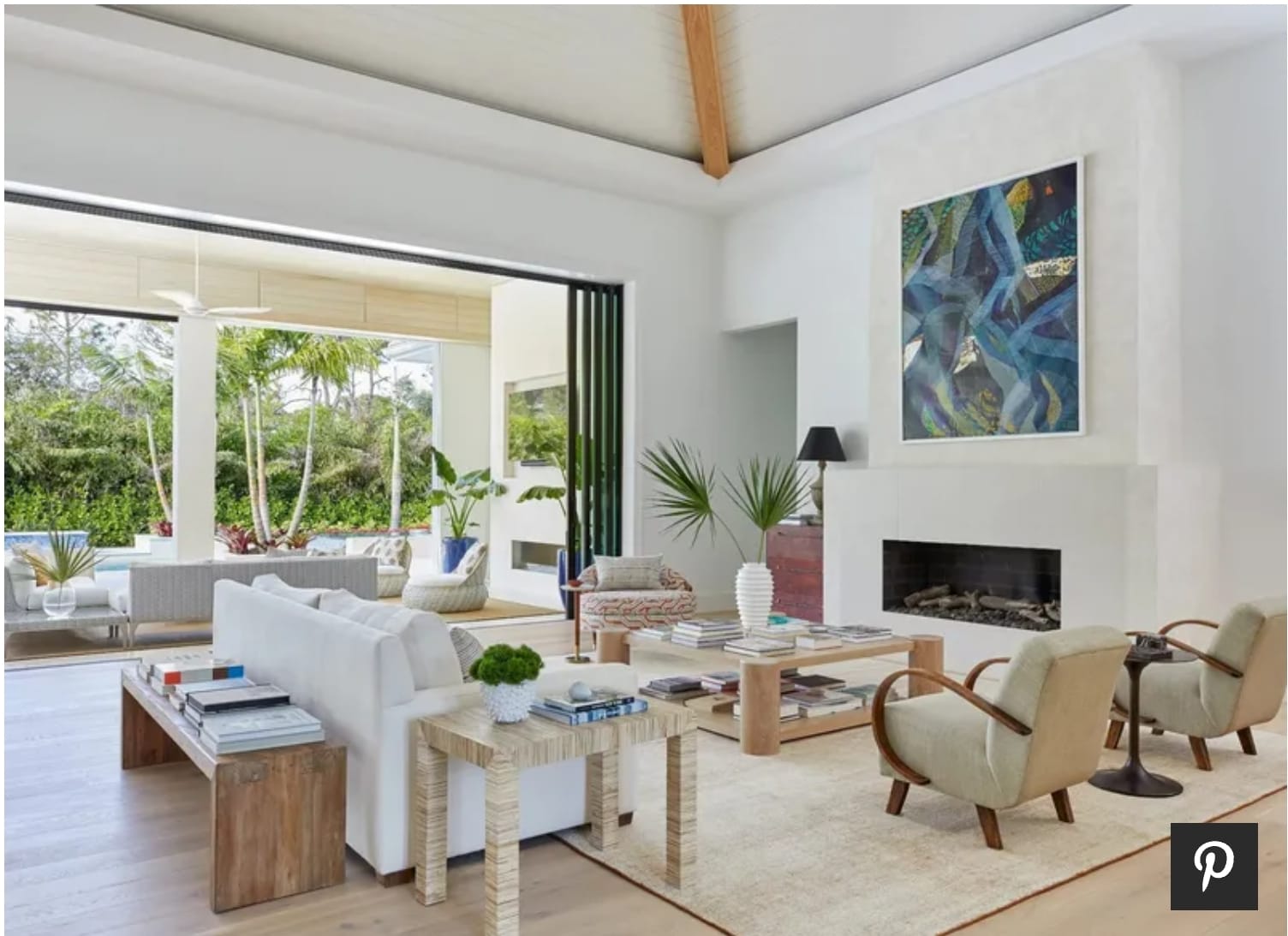 If you have lots of art to display, consider setting an elevated scene in your living room with “gallery-like allure,” as James Thomas did in this Beverly Hills home. The firm drew attention to the homeowner’s impressive contemporary art collection with design features like the soft white of the walls, which allows the bold abstract canvas pictured here to pop.